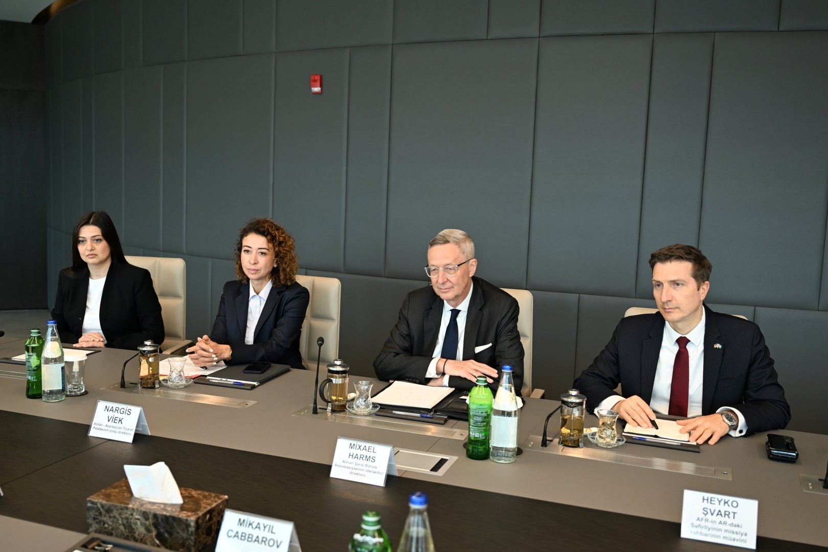 "Alman İqtisadiyyatının Şərq Komitəsinin sədri Mixael Harms ilə görüşdə işgüzar dairələr arasında əlaqələrin inkişafı perspektivlərini müzakirə etdik. Azərbaycanın əlverişli biznes ve investisiya mühitinin alman şirkətlərinin ölkəmizdə fəaliyyətinin genişləndirilməsinə yaratdığı imkanları vurğuladıq.