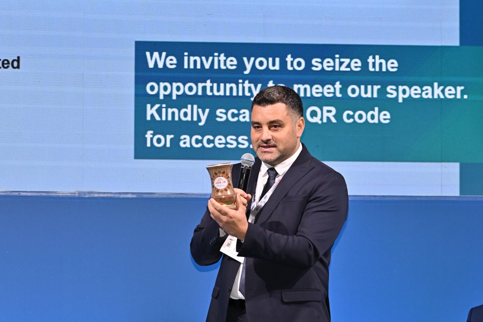Spiker kimi çıxış edən Elnur İslamov, auditoriyaya müxtəlif dillərdə salam verərək xalqlar arasında isti bir bağ yaratdı. O, çıxışında Azərbaycanın zəngin çay mədəniyyətinə də toxunaraq armudu stəkanın simvolikasını vurğuladı:
