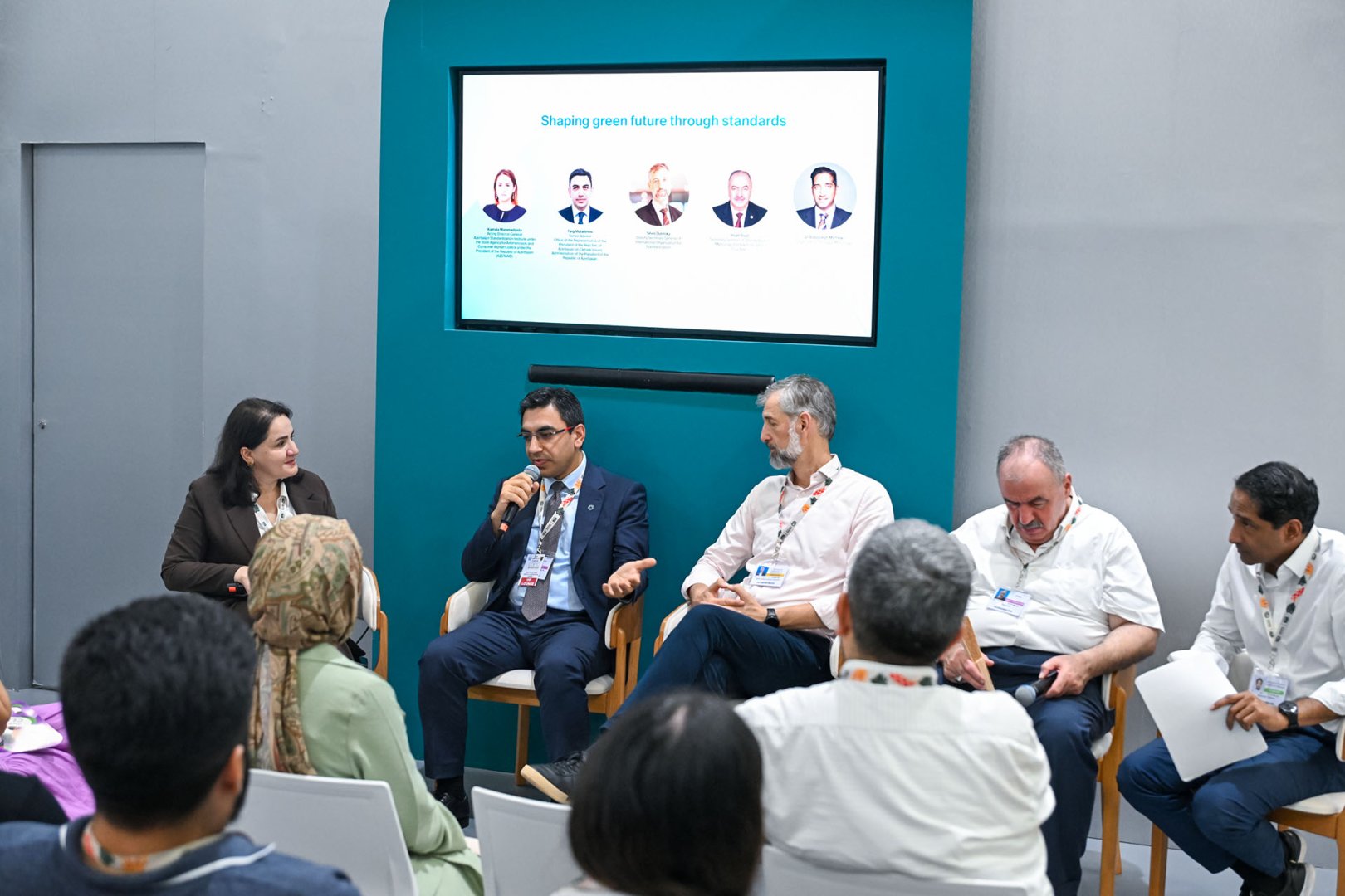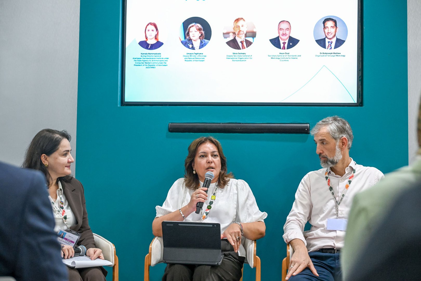 AZSTAND-ın baş direktorunun müavini, baş direktor vəzifəsini müvəqqəti icra edən Kəmalə Məmmədzadənin moderatorluğu ilə keçirilən panelin spikerləri Azərbaycan Respublikası ekologiya və təbii sərvətlər nazirinin müavini Ümayra Tağıyeva, Azərbaycan Respublikası Prezidentinin İqlim Məsələləri üzrə Nümayəndəliyinin böyük məsləhətçisi Faiq Mütəllimov, Beynəlxalq Standartlaşdırma Təşkilatının (ISO) baş katibinin müavini Silvio Dulinski, İslam ölkələri üçün Standartlar və Metrologiya İnstitutunun (SMIIC) baş katibi İhsan Övüt və Qanunverici Metrologiya üzrə Beynəlxalq Təşkilatın (OIML) prezidenti dr.Bobjozef Metyu olub.
