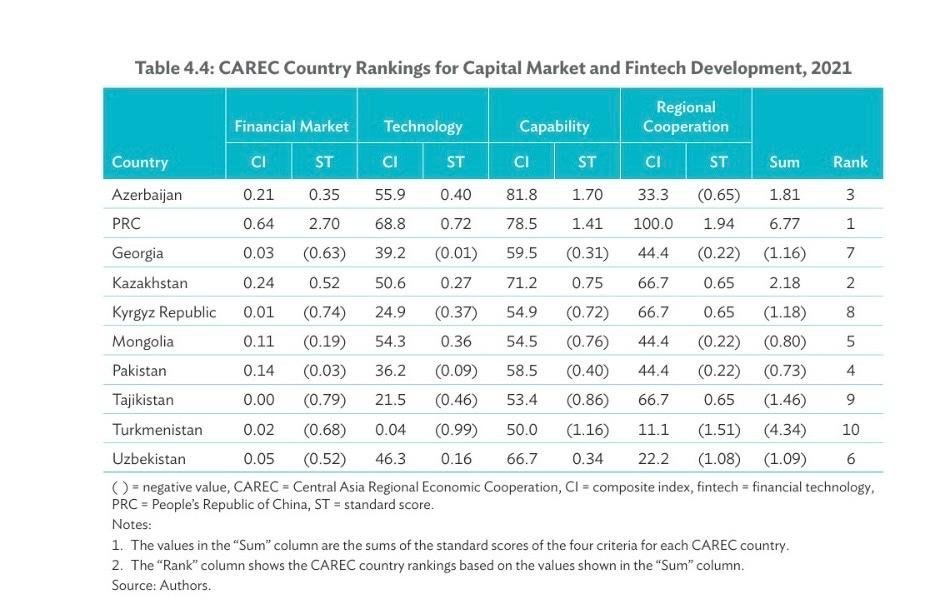 Azərbaycan kapital bazarları və fintexin inkişafı üzrə CAREC (Mərkəzi Asiya Regional İqtisadi Əməkdaşlıq) ölkələrinin reytinqində institusional və tənzimləyici imkanlar göstəricisinə görə birinci, texnoloji göstərici üzrə isə Çindən sonra ikinci yerdə qərarlaşıb.