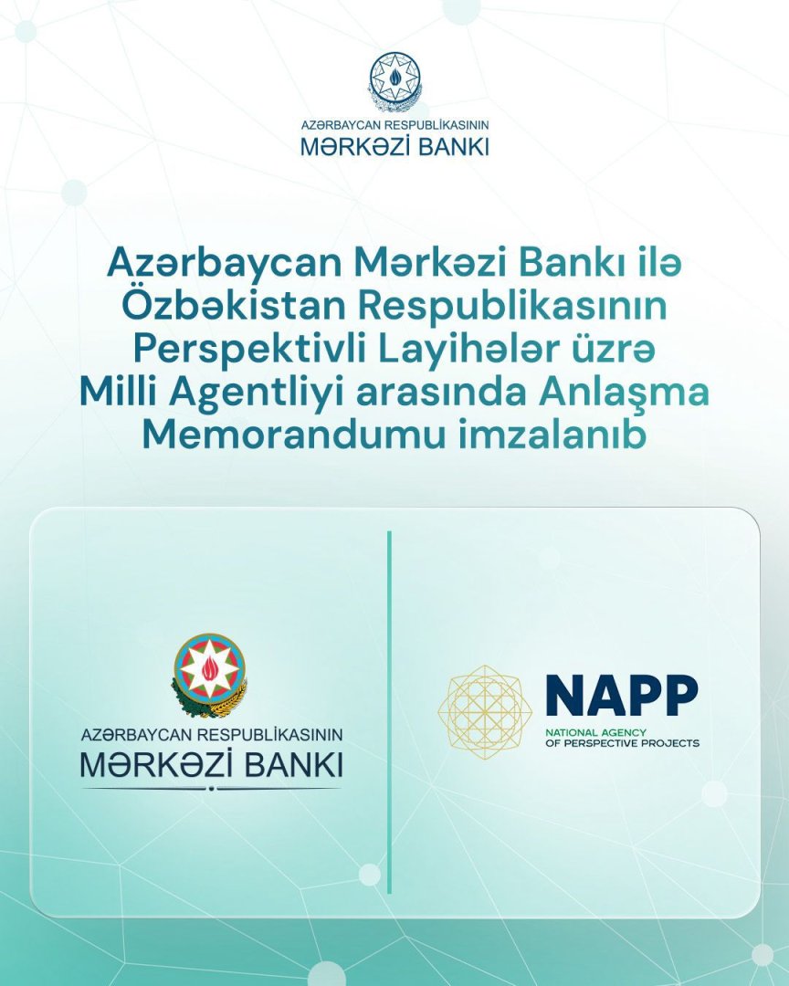 Azərbaycan Mərkəzi Bankı (AMB) və Özbəkistan Respublikasının Perspektivli Layihələr üzrə Milli Agentliyi arasında əməkdaşlığa dair Anlaşma Memorandumu imzalanıb.