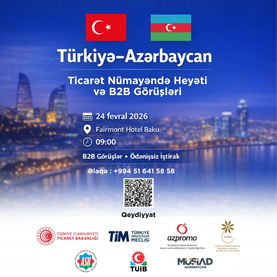 24 fevral 2026-cı il tarixində Bakıda “Türkiyə–Azərbaycan Ticarət Nümayəndə Heyəti və B2B Görüşləri” keçiriləcək.