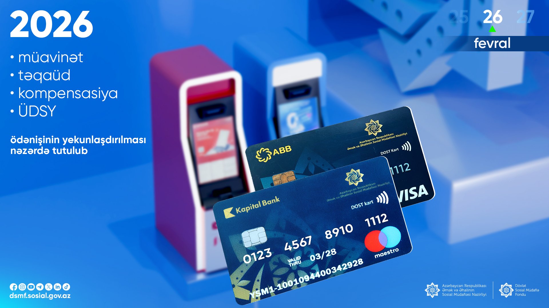 Dövlət Sosial Müdafiə Fondu tərəfindən fevralın 26-da bütün müavinət, təqaüd, kompensasiya və ünvanlı dövlət sosial yardımlarının ödənişinin yekunlaşdırılması nəzərdə tutulub.