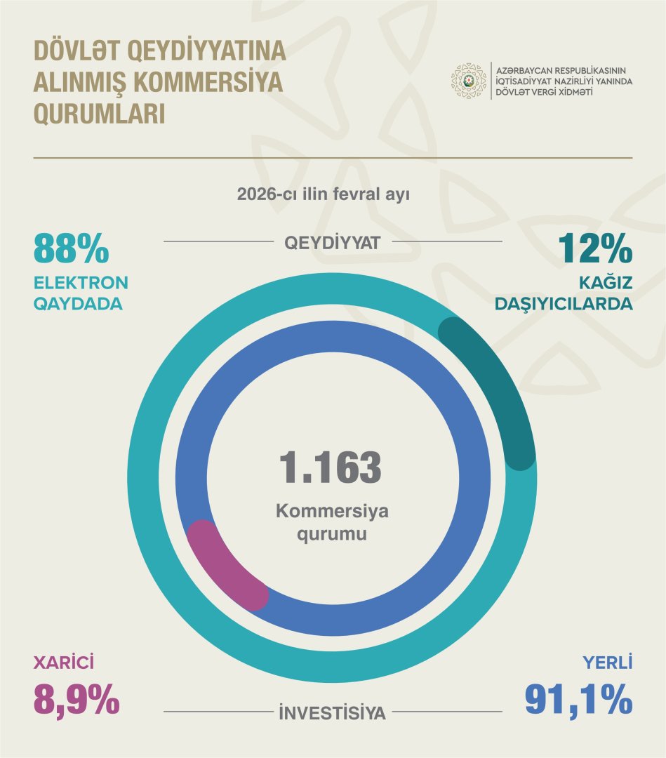 2026-cı ilin fevral ayında 1.163 vahid kommersiya qurumu dövlət qeydiyyatından keçib ki, onların 91,1 faizi yerli investisiyalı, 8,9 faizi isə xarici investisiyalıdır. Kommersiya qurumlarının 88 faizi elektron qaydada qeydiyyata alınıb. 2026-cı ilin yanvar-fevral aylarında qeydiyyatdan keçmiş yerli investisiyalı məhdud məsuliyyətli cəmiyyətlərin e-qeydiyyatının xüsusi çəkisi isə 97,4 faiz təşkil edib.