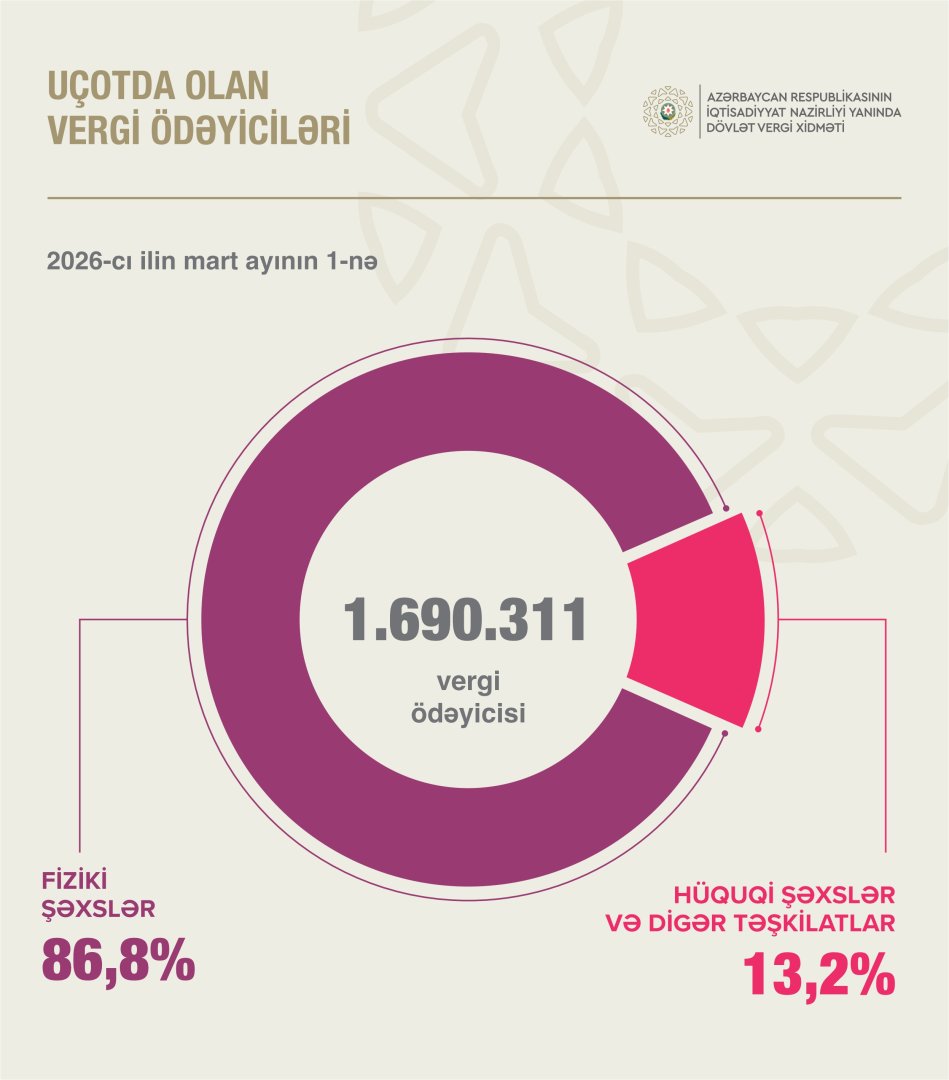 2026-cı ilin mart ayının 1-nə respublika üzrə uçotda olan 1.690.311 vergi ödəyicisinin 86,8 faizi fiziki şəxslər, 13,2 faizi hüquqi şəxs və digər təşkilatlar olub. Ötən ilin müvafiq dövrü ilə müqayisədə vergi ödəyicilərinin ümumi sayı 4,9 faiz, o cümlədən fiziki şəxslərin sayı 4,7 faiz, hüquqi şəxslərin sayı 6,3 faiz artıb.TurkicWorld xəbər verir ki, bu barədə Dövlət Vergi Xidmətinin İdarə rəisinin müavini Günel Bəhramqızı məlumat verib.