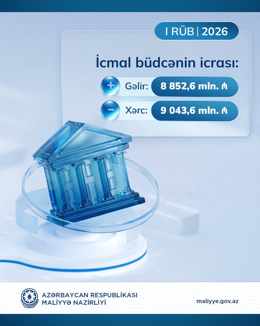 2026-cı ilin yanvar-mart ayları ərzində icmal büdcənin gəlirləri 8 852,6 milyon manat, xərcləri isə 9 043,6 milyon manat məbləğində icra edilib.