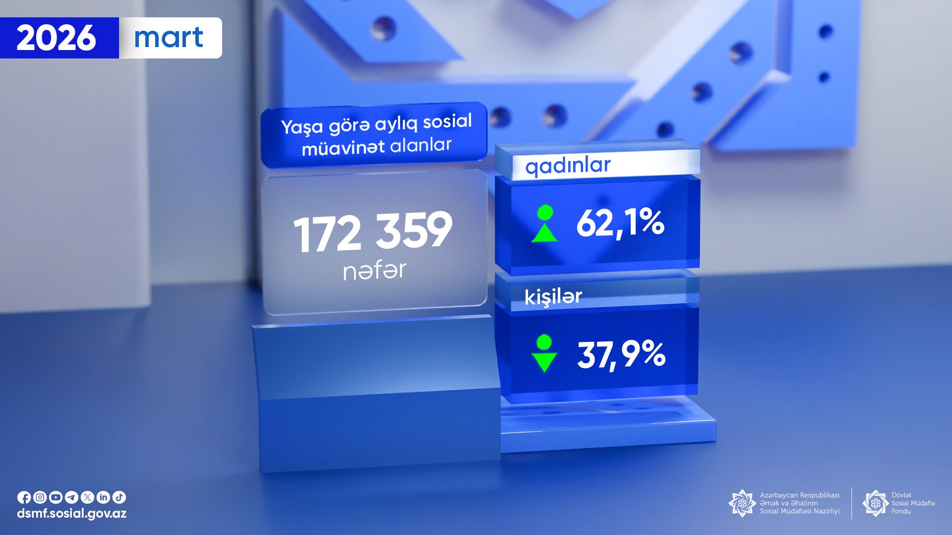 2026-cı ilin mart ayında yaşa görə aylıq sosial müavinət alanların sayı 172 359 nəfər olub.