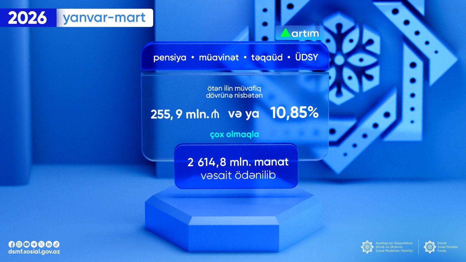 2026-cı ilin yanvar-mart ayları ərzində pensiya, müavinət, təqaüd və ünvanlı dövlət sosial yardımları üzrə əhaliyə ötən ilin müvafiq dövrünə nisbətən 255,9 milyon manat və ya 10,85% çox olmaqla 2 614,8 milyon manat vəsait ödənilib.