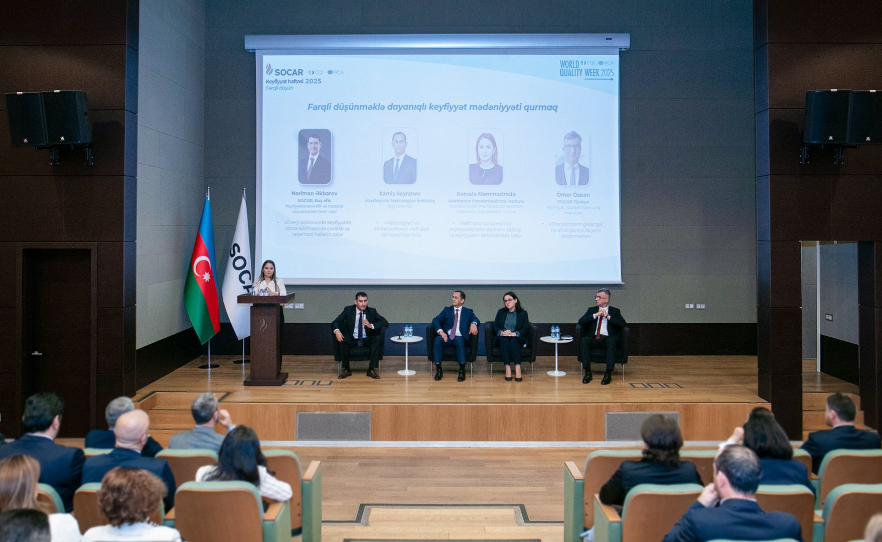 “Fərqli düşünməklə dayanıqlı keyfiyyət mədəniyyəti qurmaq” mövzusunda təşkil olunan panel müzakirəsində Azərbaycan Metrologiya İnstitutunun baş direktoru Xamis Seyranov, Azərbaycan Standartlaşdırma İnstitutunun baş direktorunun müavini Kəmalə Məmmədzadə, SOCAR-ın departament rəisi Nəriman Əkbərov və SOCAR Türkiyənin Keyfiyyət idarəetməsi üzrə meneceri Ömər Özkan çıxış ediblər. AzMİ-nin baş direktoru Xamis Seyranov “Metrologiya və kalibrlənmənin neft-qaz sənayesində rolu”, AZSTAND-ın baş direktorunun müavini Kəmalə Məmmədzadə isə “Neft-qaz sənayesində beynəlxalq standartların tətbiqi və keyfiyyətin təminatında rolu” mövzusunda çıxış ediblər.