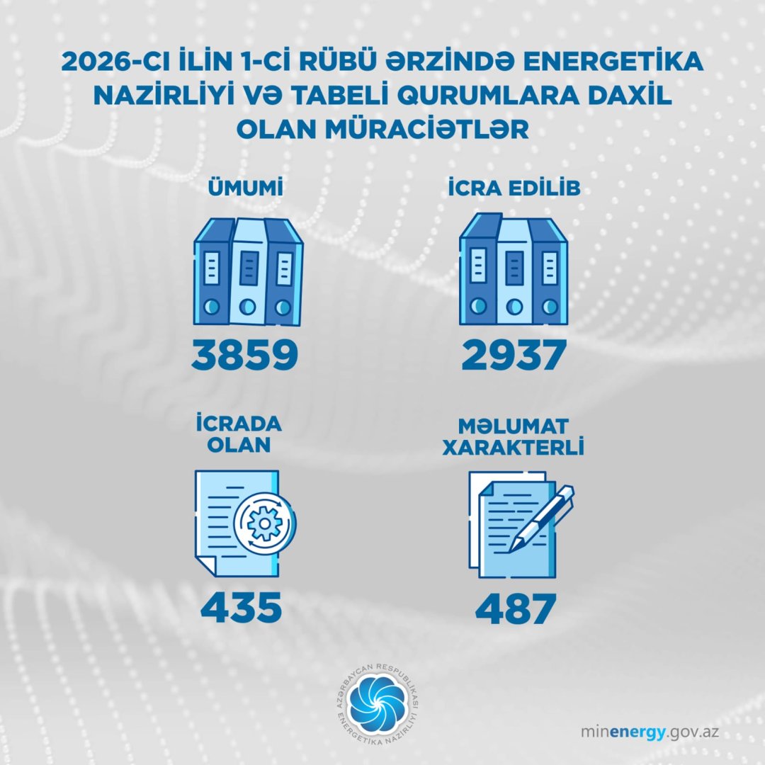 Cari ilin 3 ayı ərzində Energetika Nazirliyi və tabeli qurumlara ümumilikdə 3859 vətəndaş müraciəti daxil olub.