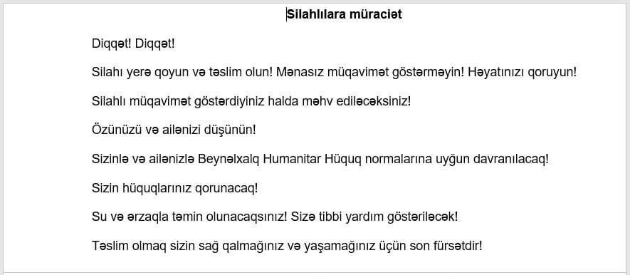 Qeyd edək ki, Azərbaycan Respublikasının Silahlı Qüvvələri tərəfindən Azərbaycanın Qarabağ bölgəsində keçirilən lokal xarakterli antiterror tədbirləri davam edir.