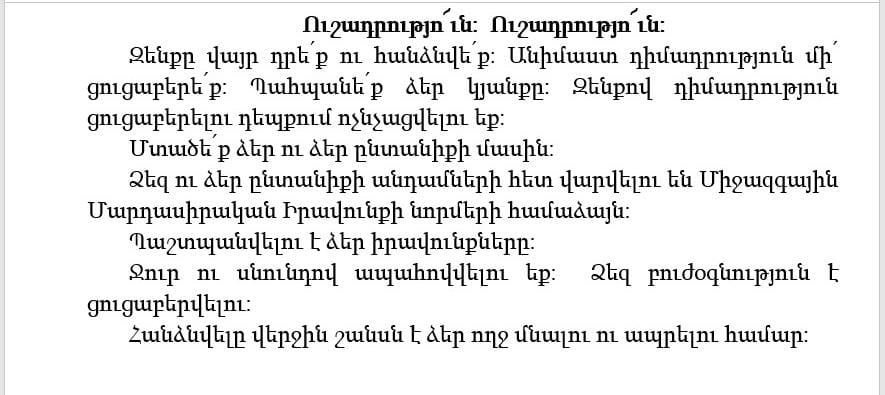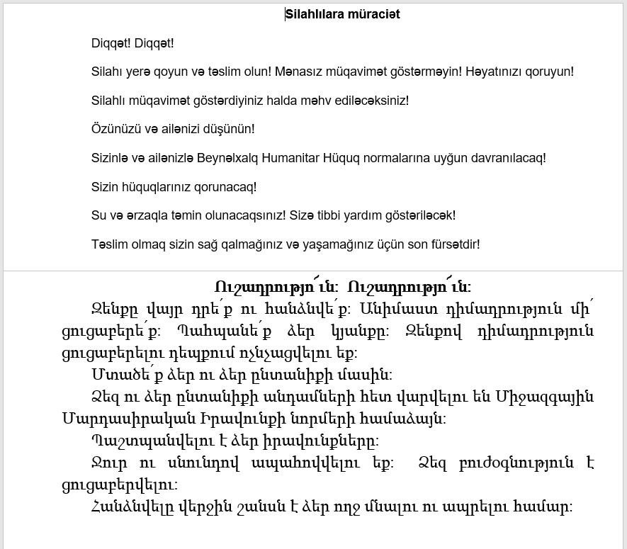 Tədbirlər çərçivəsində yalnız legitim hərbi obyektlər və hərbi infrastruktur dəqiq silahlarla hədəfə alınır və sıradan çıxarılır. Yaşayış yerlərinin yaxınlığında atəş vasitələrinin Ermənistan silahlı qüvvələrinin birləşmələri tərəfindən yerləşdirilməsini nəzərə alaraq ərazidə olan mülki əhalini hərbi obyektlərdən kənar durmağa və Ermənistan silahlı qüvvələrinin birləşmələrinə dəstək olmamağa çağırırıq. Bu barədə mobil SMS xidməti vasitəsilə Azərbaycanın Qarabağ bölgəsinin erməni sakinlərinə məlumat göndərilib. Eyni zamanda səsgücləndirici texniki vasitələrlə əhali xəbərdar edilir və məlumat vərəqələri paylanılır. Azərbaycan Respublikasının qanunlarına və beynəlxalq humanitar hüquq normalarına uyğun olaraq təhlükəsizliyinə zəmanət verilən inzibati, sosial, təhsil, tibbi, dini və digər obyektlərin mühafizə və müdafiəsi təşkil olunacaq.