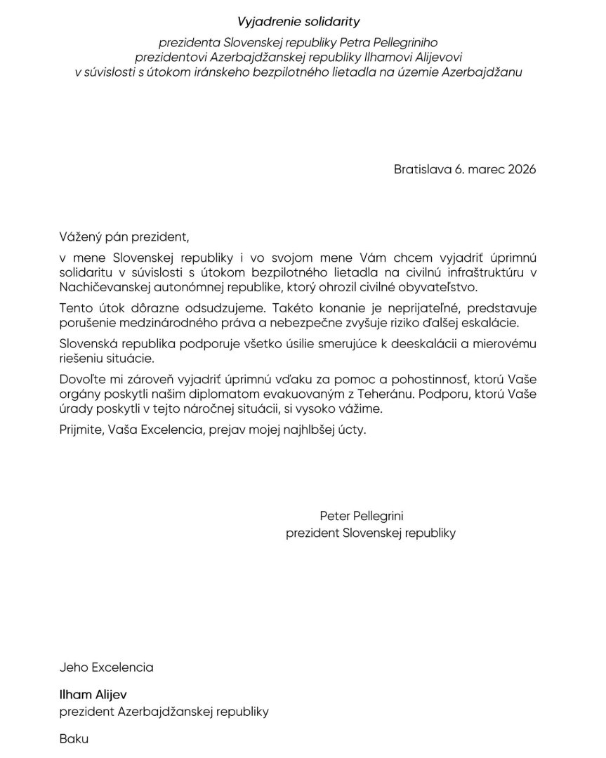 Azərbaycan Respbulikasının Prezidenti İlham Əliyev İranın Naxçıvana etdiyi PUA hücumundan sonra Azərbaycana göstərdiyi dəstəyə görə Slovakiya Prezidenti Peter Pelleqriniyə təşəkkür edib.
