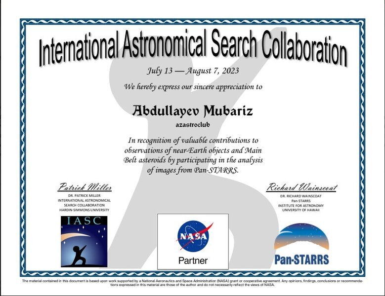 TurkicWorld-un Sonxeber.az saytına istinadən verdiyi məlumata görə, bu ilin son üç ayda kəşf edilmiş p11GWuo(AZE0001), p11H740(AZE0004) və P11Hg3H(AZE0008) və P21KVWS (AZE0010), P21L9uH (AZE0012) asteroidlər IASC (Beynəlxalq Astronomik Axtarış Əməkdaşlığı ) kataloguna daxil edilib.