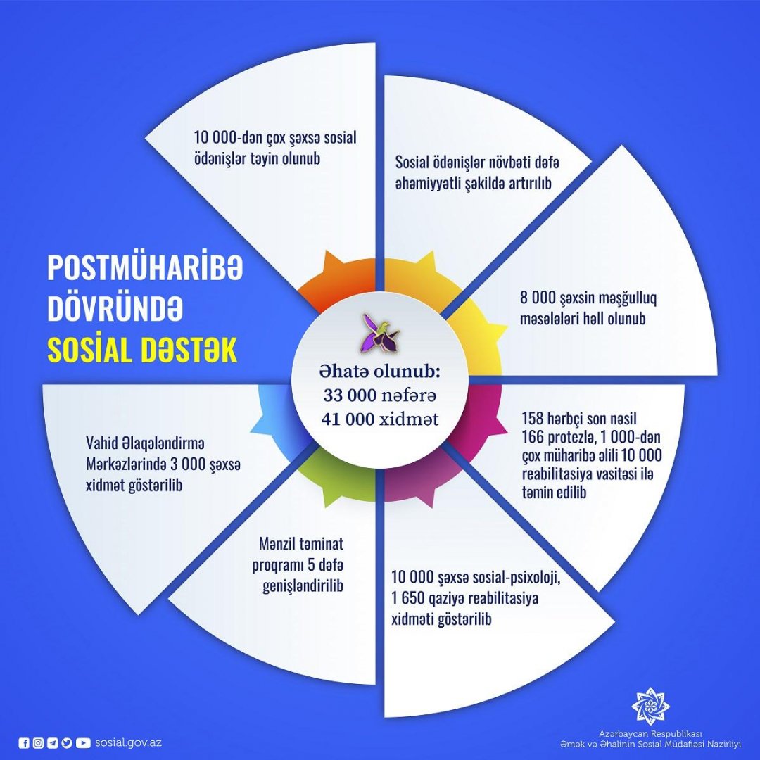 Postmüharibə dövründə Vətən müharibəsi şəhidlərinin ailə üzvləri, qazilər və ailə üzvləri və erməni terrorundan zərər çəkənlərdən ibarət 3 min ailə üzrə 10 minədək şəxsə sosial-psixoloji dəstək göstərilib. Son illərdə müasir tələblərə uyğun qurulan reabilitasiya müəssisələri qazilərimizin keyfiyyətli xidmətlərlə təminatında xüsusi önəm kəsb edir. Həmin müəssisələrdə son bir ildə 1 650 qaziyə sosial-psixoloji dəstək və reabilitasiya xidmətləri göstərilib.