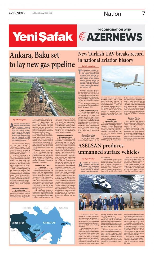 Turkic.World xəbər verir ki, "Azernews" oxuculara qəzetin çap versiyasında ayrıca səhifədə "Yeni Şafak"ın tanınmış yazarları tərəfindən hazırlanmış siyasət, iqtisadiyyat, sosial, mədəniyyət sahəsində aktual xəbərləri təqdim edəcək. Layihənin məqsədi Azərbaycan-Türkiyə əlaqələrinə, o cümlədən, media və informasiya mübadiləsi sahəsində də gələcək inkişafa töhfə verməkdir.