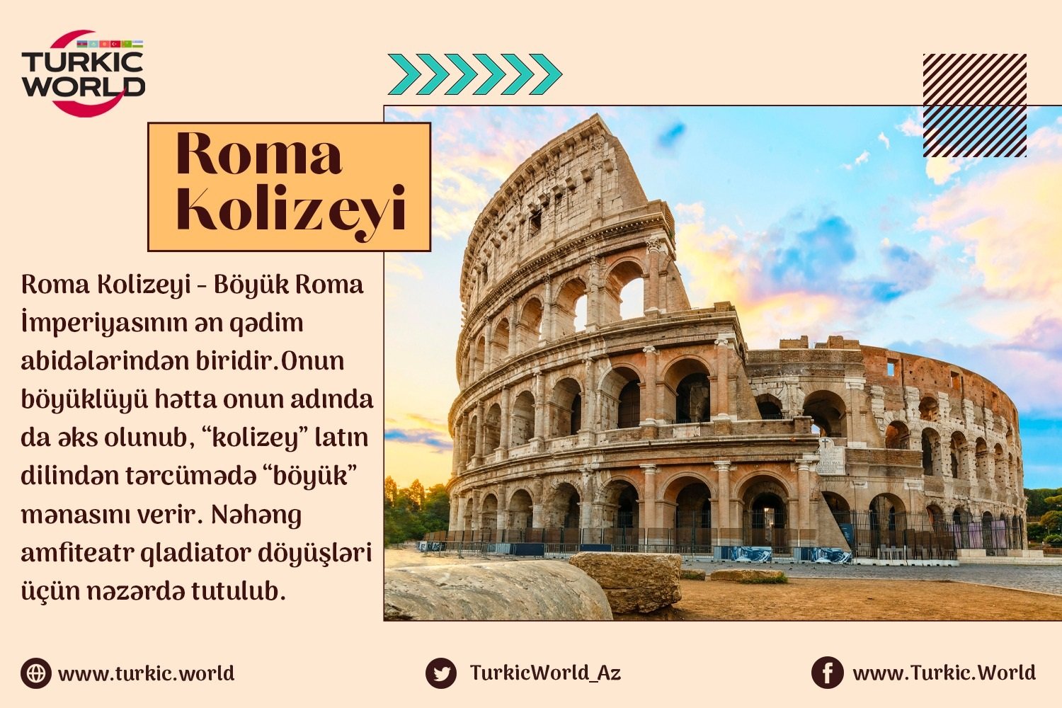 Roma Kolizeyi - Böyük Roma İmperiyasının ən qədim abidələrindən biridir. Onun böyüklüyü hətta onun adında da əks olunub, “kolizey” latın dilindən tərcümədə “böyük” mənasını verir. Nəhəng amfiteatr qladiator döyüşləri üçün nəzərdə tutulub. Bununla yanaşı, orada vəhşi heyvan döyüşləri, dənizçiliyə aid və müxtəlif digər oyunlar səhnələşdirilib.