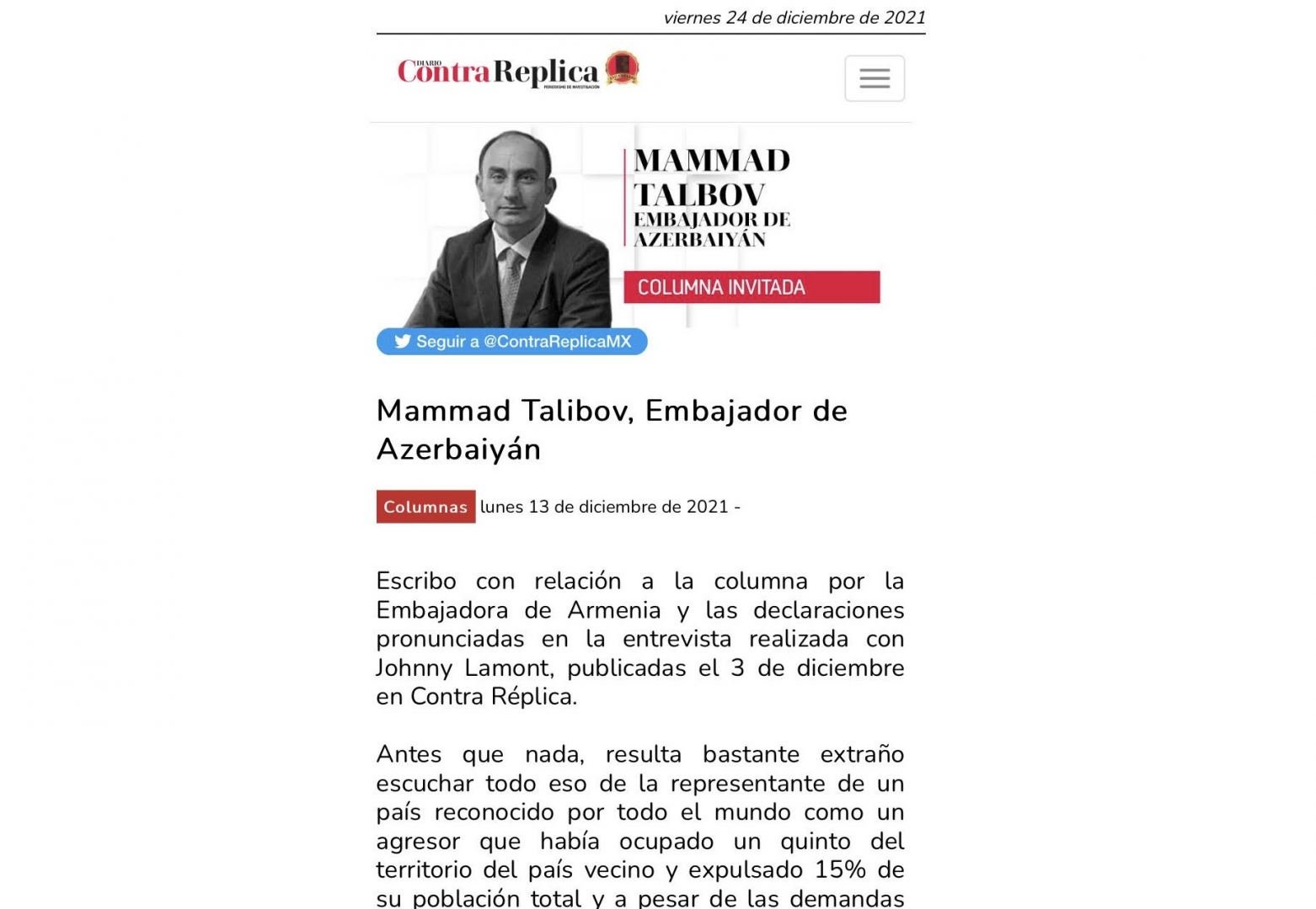 Meksikanın nüfuzlu KİV-lərindən olan “ContraReplica” qəzetlində səfir Məmməd Talıbovun Ermənistanın keçmiş münaqişə ərzində törətdiyi müharibə cinayətləri, hazırda Cənubi Qafqazda gərginliyin artmasına səbəb olan təxribatçı addımları, regionun yeni reallıqları, burada Azərbaycan tərəfindən görülən işlər və bölgədə davamlı sülhün əsas şərtləri barədə məqaləsi dərc olunub.