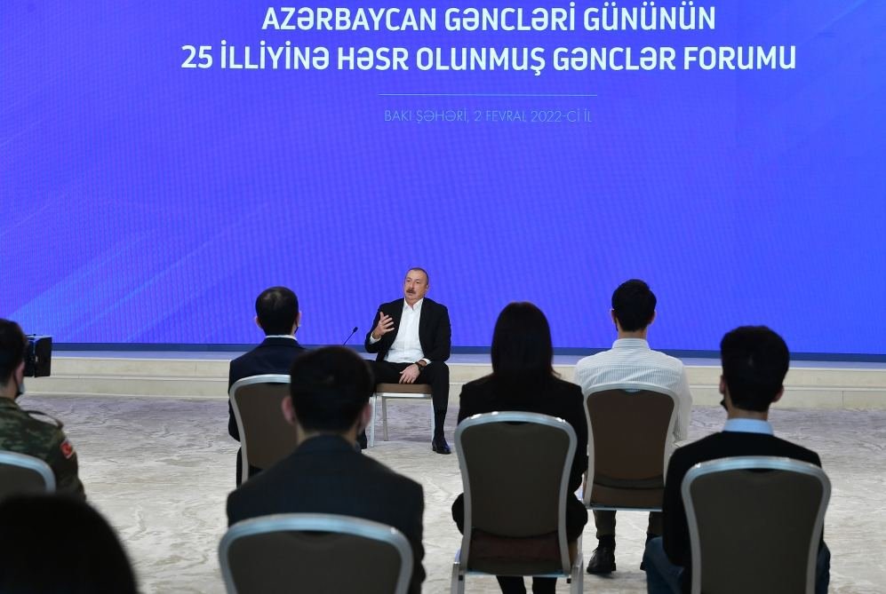 Prezident İlham Əliyev Azərbaycan Gəncləri Gününün 25 illiyinə həsr olunmuş Gənclər Forumunda iştirak etdi və gəncləri maraqlandıran sualları cavablandırdı. Gülüstan sarayında təşkil olunan Gənclər Forumunda gənc sahibkarlar, dövlət proqramlarının iştirakçıları, keçmiş məcburi köçkün, şəhid ailələrinin gənc üzvləri, Vətən müharibəsi iştirakçıları, təhsildə və sosial inklüziv fəaliyyətdə fərqlənənlər iştirak ediblər.