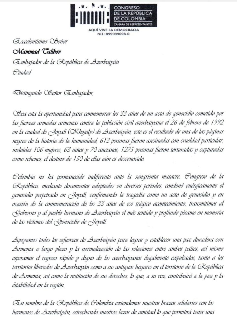 Kolumbiya Konqresinin Nümayəndələr Palatasının Kolumbiya-Azərbaycan dostluq qrupunun üzvləri Xocalı soyqırımının 33-cü ildönümü və Qərbi Azərbaycanlıların qayıdış hüququnun bərpası ilə əlaqədar ölkəmizin Kolumbiyadakı səfiri Məmməd Talıbova açıq məktub ünvanlayıb. Məktubda 33 il öncə 26 fevral 1992-ci il tarixində Ermənistan silahlı qüvvələri tərəfindən Azərbaycanın Xocalı şəhərində dinc sakinlərə qarşı törədilmiş soyqırım aktının bəşəriyyət tarixinin qanlı səhifələrindən biri olduğu bəyan edilir, həmin gecə 106 qadın, 63 uşaq və 70 qoca daxil olmaqla, 613 azərbaycanlının xüsusi qəddarlıqa qətlə yetirildiyi vurğulanır.