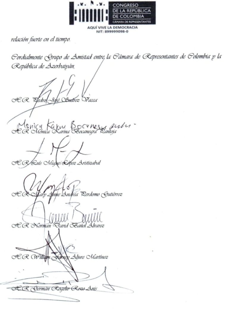 TurkicWorld xəbər verir ki, məktubda Kolumbiyanın bu qanlı hadisəyə biganə qalmadığı, müxtəlif dövrlərdə Kolumbiya Konqresi tərəfindən qəbul edilmiş sənədlərdə Xocalıda həyata keçirilmiş qətliamın qətiyyətlə pislənildiyi və soyqırım aktı kimi təsbit olunduğu bildirilir. Bu dəhşətli hadisənin 33-cü ildönümü ilə bağlı Xocalı qurbanlarının xatirəsi ehtiramla yad edilməklə, Azərbaycan Hökumətinə və qardaş Azərbaycan xalqına dərin hüznlə başsağlığı verilir.