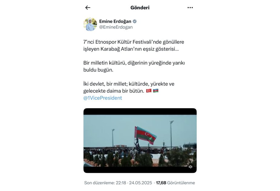 Trend xəbər verir ki, bu fikirləri Türkiyə Prezidentinin həyat yoldaşı Əminə xanım Ərdoğan VII Etnoidman Beynəlxalq Mədəniyyət Festivalında Azərbaycan nümayəndə heyətinin təqdimatındakı möhtəşəm "Zəfər" şou-kompozisiyasını izlədikdən sonra sosial media hesabında etdiyi paylaşımda bildirib.