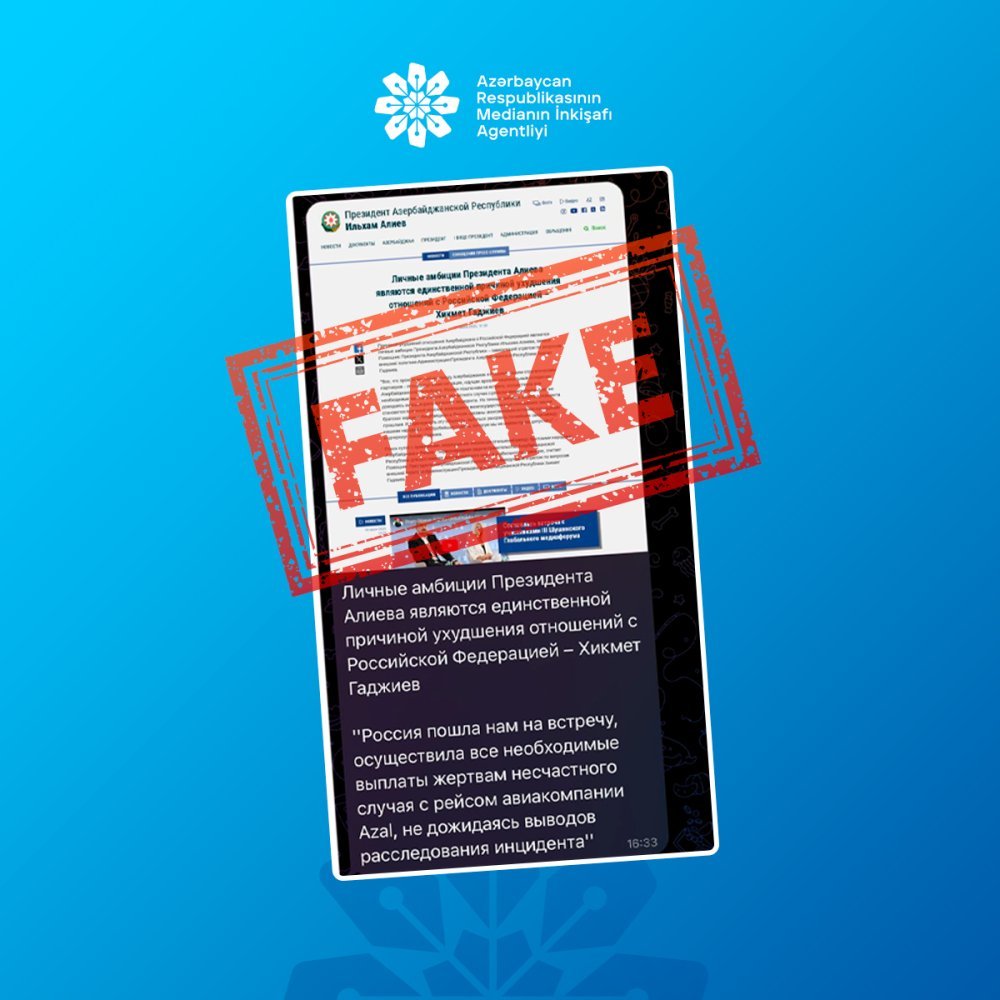 Medianın İnkişafı Agentliyindən TurkicWorld-a bildirilib ki, Azərbaycan Respublikası Prezidentinin rəsmi saytının görüntüsünü imitasiya edərək hazırlanmış və uydurma iddiaların yer aldığı bu açıqlama ictimai rəyi çaşdırmağa yönələn kobud informasiya manipulyasiyası nümunəsidir.