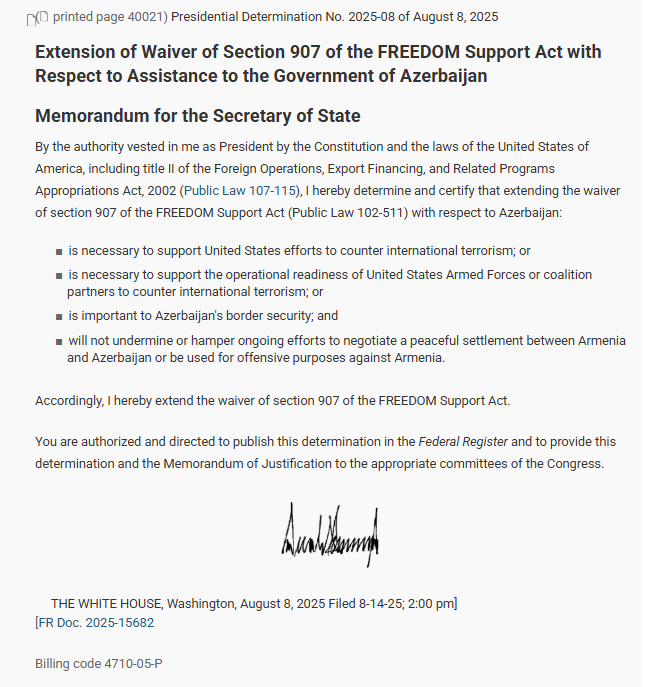 ABŞ prezidenti Donald Tramp Azadlığa Dəstək Aktının 907-ci maddəsinin fəaliyyətinin dayandırılması haqqında memorandum imzalayıb.