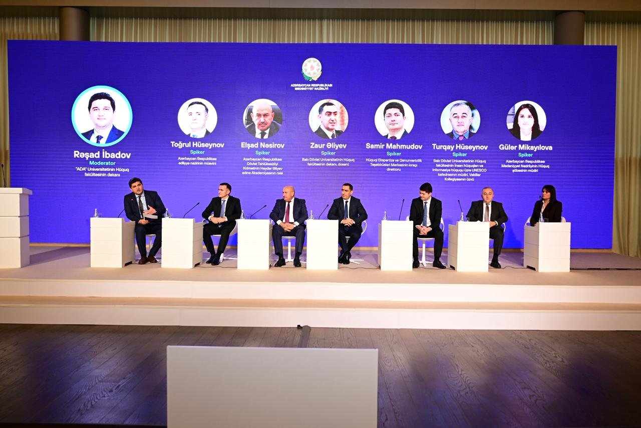 Azərbaycan Respublikası ədliyyə nazirinin müavini Toğrul Hüseynov, Dövlət Təhlükəsizliyi Xidmətinin Heydər Əliyev adına Akademiyasının rəisi Elşad Nəsirov, Bakı Dövlət Universiteti (BDU) Hüquq fakültəsinin İnsan hüquqları və informasiya hüququ üzrə UNESCO kafedrasının müdiri Turqay Hüseynov, BDU-nun Hüquq fakültəsinin dekanı Zaur Əliyev, Hüquqi Ekspertiza və Qanunvericilik Təşəbbüsləri Mərkəzinin icraşı direktoru Samir Mahmudov və Mədəniyyət Nazirliyi Hüquq şöbəsinin müdiri Gülər Mikayılova çıxış ediblər.