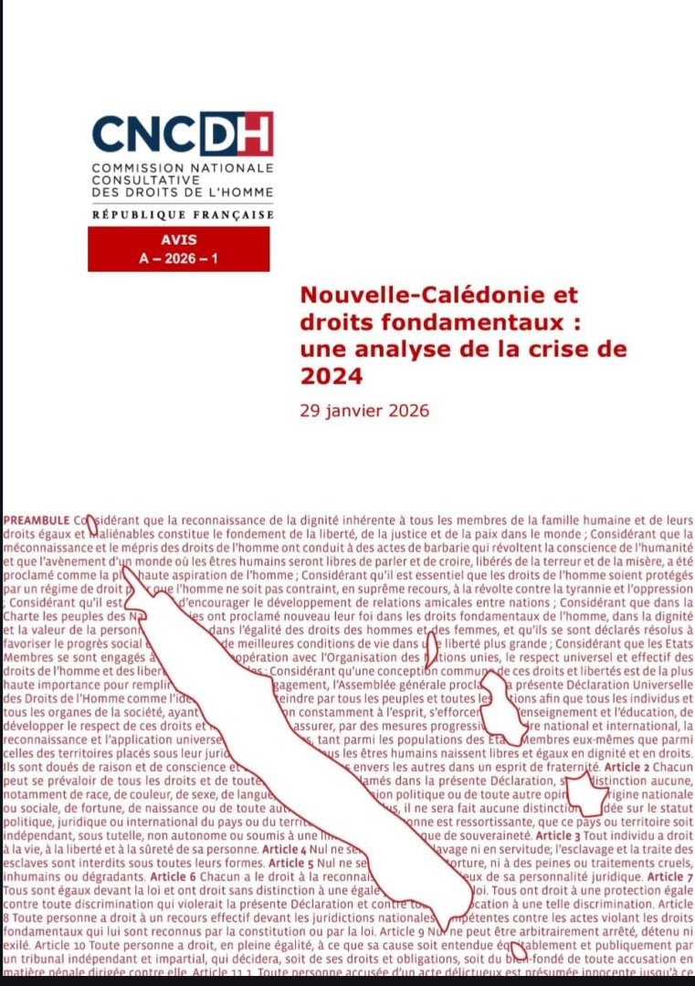 İnsan hüquqları üzrə milli məsləhətçi komissiya (La Commission nationale consultative des droits de l’homme) 29 yanvar 2026-cı il tarixində Kanakidə (Yeni Kaledoniya) baş vermiş etiraz aksiyalarına dair rəsmi hesabat dərc etmişdir.