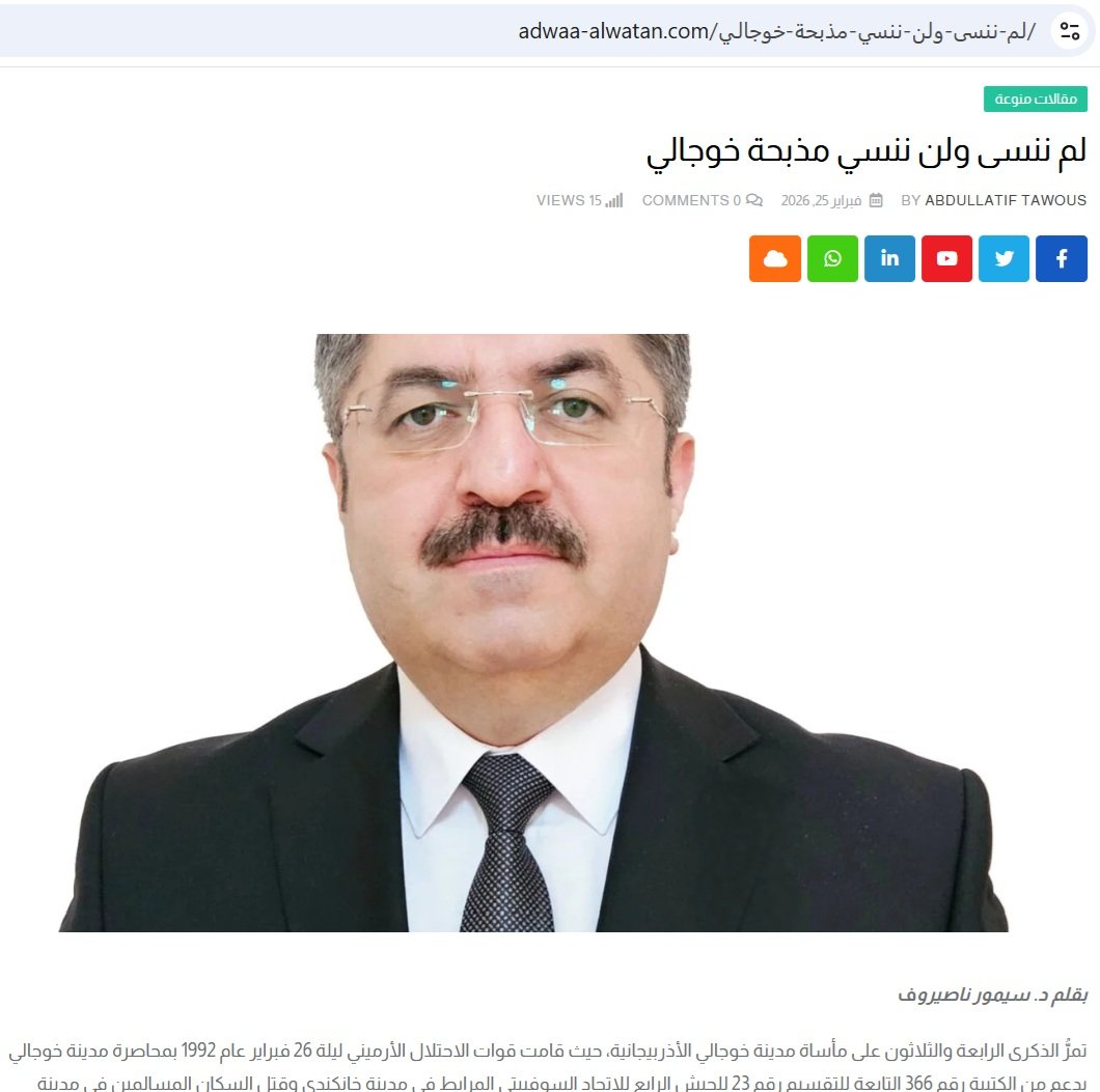 Misir, Əlcəzair, İraq, Suriya və.s ərəb ölkələri mediasında Azərbaycan-Misir Dostluq Cəmiyyətinin İdarə Heyətinin sədri, tədqiqatçı-alim Seymur Nəsirovun Xocalı soyqırımının 34-cü ildönümü ilə bağlı məqaləsi dərc olunub.