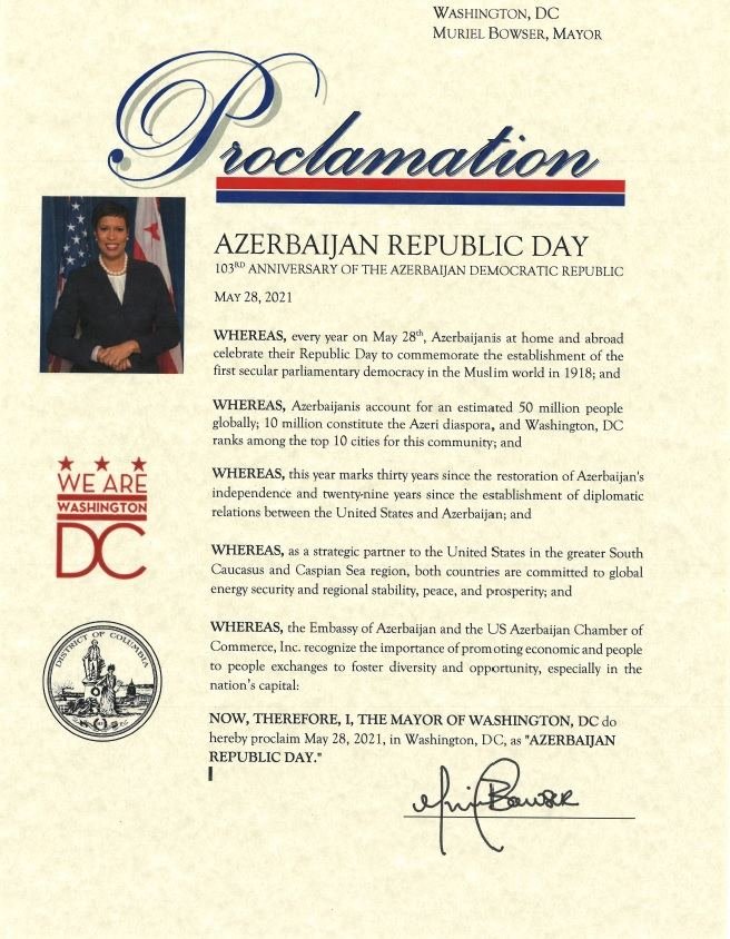 Vaşinqton şəhərinin meri Myuriel Bauzer Azərbaycan Demokratik Respublikasının yaranmasının 103-cü ildönümü ilə bağlı 28 May tarixini Respublika Günü elan edib və bununla bağlı Bəyannamə imzalayıb.