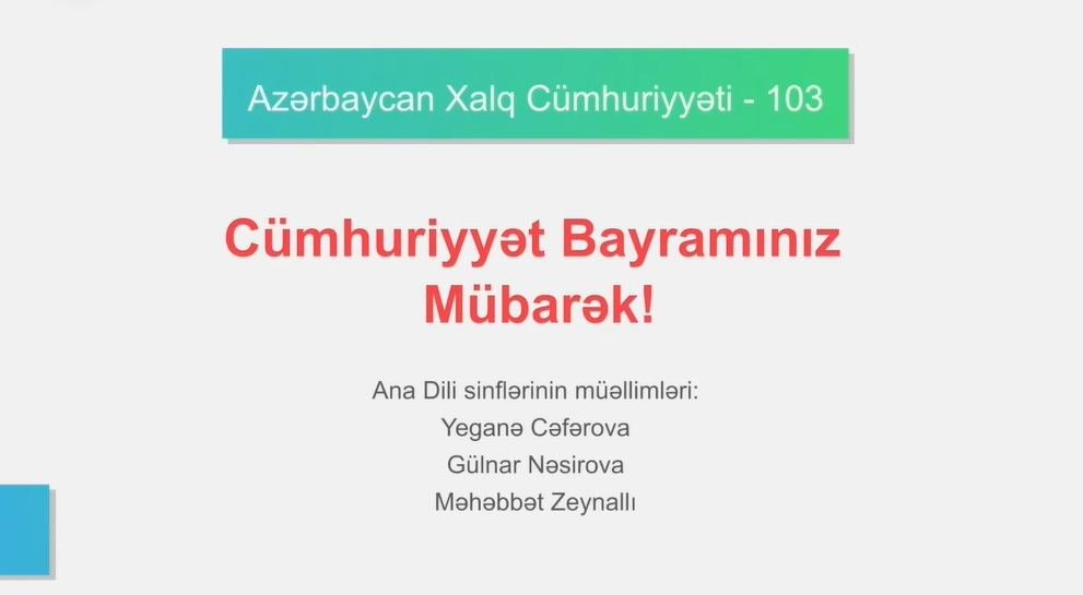 Kanadada Azərbaycan dilinin tədrisi ilə məşğul olan həmyerlimiz Yeganə Cəfərovanın rəhbəri olduğu "Toronto Azərbaycan Dili Sinfi"nin şagirdləri 28 May - Azərbaycan Demokratik Respublikasının yaranmasının 103-cü ildünümü münasibətilə xalqımıza öz təbriklərini çatdırıblar. Şagirdlər öz təbrik çıxışlarında bildiriblər ki, 28 May müsəlman Şərqində ilk dünyəvi demokratik dövlət olan Azərbaycan Xalq Cümhuriyyətinin yaranması günüdür və 1990-cı ildən bu şanlı tarix dövlət bayramı kimi qeyd edilir.