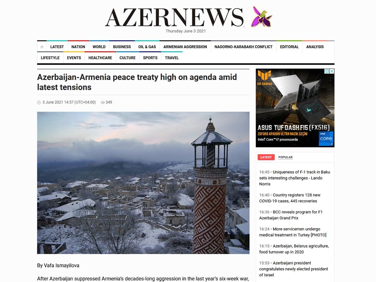 "Azernews" qəzetinin 3 iyun tarixli sayında işıq üzü görmüş məqalədə Ermənistanla Azərbaycan arasında müharibə başa çatdıqdan sonra sülh müqaviləsinin imzalanmasının zəruriliyindən bəhs edilir.