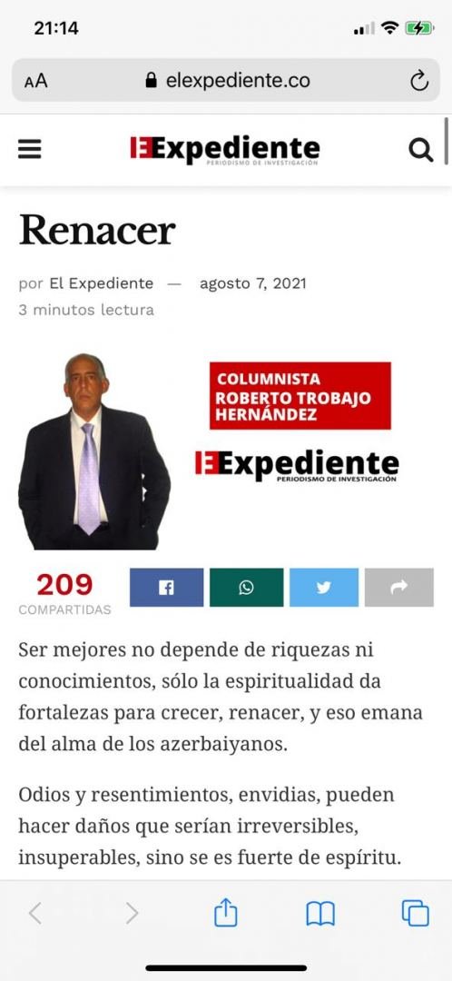 Kolumbiyanın nüfuzlu siyasi xəbər agentliklərindən olan “El Expediente” və “LaOtraCara” portallarında tanınmış jurnalist Roberto Trobaxonun işğaldan azad olunmuş ərazilərimizə etdiyi səfərin təəssüratları barədə “Azərbaycanın yenidən dünyaya gəlişi” başlıqlı məqaləsi dərc olunub.