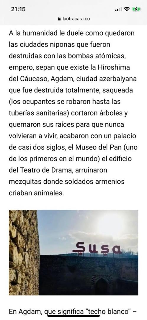 Azərbaycanın Meksikadakı Səfirliyindən Turkic.World-ə verillən məlumata görə, Cəbrayıl, Fizuli, Gəncə, Ağdam və Şuşa şəhərlərində səfərdə olmuş jurnalist yazısında 30 ilə yaxın işğalda saxlanılmış Azərbaycan ərazilərində Ermənistan tərəfindən mülki yaşayış infrastrukturunun, dini ibadət yerlərinin, memarlıq nümunələrinin və çoxəsrlik mədəniyyət incilərinin dağıdıldığını və yağmalandığını bildirir.
