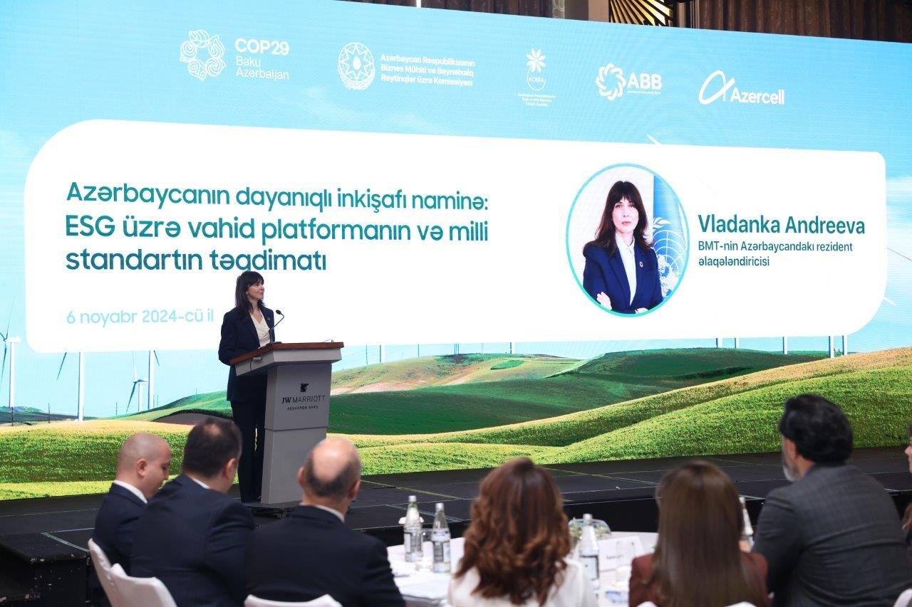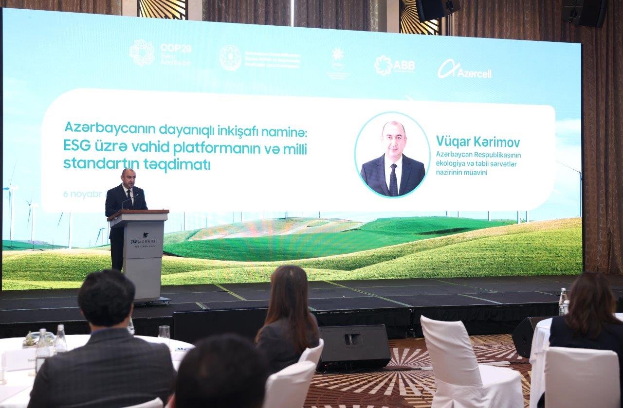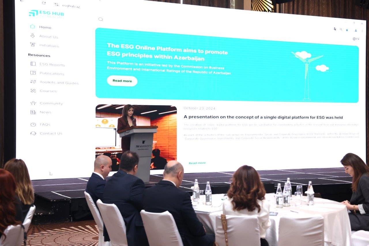 Tədbir çərçivəsində Azərbaycan Respublikası Prezidentinin Administrasiyasının İqtisadi siyasət və sənaye məsələləri şöbəsinin baş məsləhətçisi Gülnaz Cavadova ESG üzrə vahid platformaya (https://esghub.az/) və Azərbaycan Standartlaşdırma İnstitutunun Baş direktoru İlham Bayramov ESG üzrə milli standarta dair təqdimatlarla çıxış edib, BMT Azərbaycanın Tərəfdaşlıq və İnkişaf Məsələləri üzrə məsul şəxsi Ülviyyə Əkbər ESG platformasının ideyası barədə məlumat verib. Vurğulanıb ki, ESG üzrə vahid platforma daima yenilənən və ESG ilə əlaqəli hərtərəfli məlumat və materialları birləşdirən resurs mərkəzi rolunu oynayacaq. Platforma bizneslərin cari vəziyyəti, dayanıqlılığı, ESG hesabatlılığı üzrə indikator və məlumatları təmin etməklə, xarici investorların cəlb edilməsinə xidmət edəcək. Tərəfdaşlar ESG ilə əlaqəli xidmətlərini bu platforma üzərindən biznes subyektlərinə təqdim edə biləcək, bizneslər isə ESG üzrə təcrübəli mütəxəssis və peşəkar şirkətlərə çıxış imkanı əldə edəcəklər. Platforma ətraf mühit və dayanıqlı inkişaf məsələlərinə, beynəlxalq reytinqlərdə ekoloji performansla bağlı göstəricilərə müsbət töhfə verəcək. Azərbaycanın COP29-a ev sahibliyi etməyə hazırlaşdığı ərəfədə istifadəyə verilən ESG üzrə vahid platforma həm də ölkənin ekoloji dayanıqlılığa sadiqliyini bir daha nümayiş etdirir.