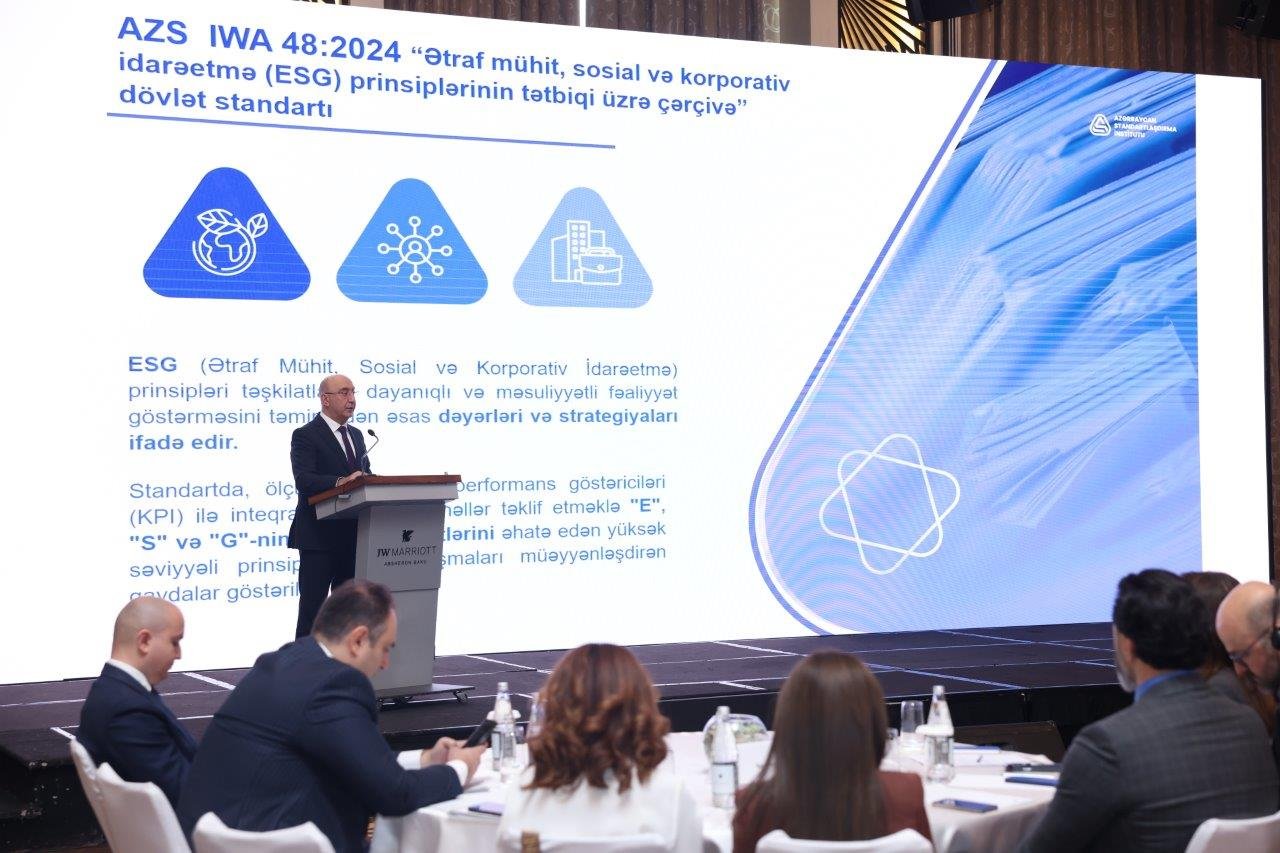 Konfransda qeyd olunub ki, ESG üzrə milli standart KOBİA-nın təşəbbüsü ilə Biznes mühiti və beynəlxalq reytinqlər üzrə Komissiya çərçivəsində Beynəlxalq Standartlaşdırma Təşkilatının tövsiyələrinə əsasən hazırlanıb və bu yaxınlarda Azərbaycan Standartlaşdırma İnstitutu tərəfindən qəbul olunub. "AZS IWA 48:2024 "Ətraf mühit, sosial və korporativ idarəetmə (ESG) prinsiplərinin tətbiqi üzrə çərçivə" dövlət standartı müvafiq sahədə qəbul olunmuş ilk təcrübələrdən hesab edilir. Yeni dövlət standartı müəssisə və təşkilatlarda ESG prinsiplərini tətbiq etməklə müasir biznes mühitində dayanıqlı inkişafı dəstəkləmək və sosial məsuliyyəti təşviq etmək üçün çərçivə təqdim edir. Standartın məqsədi müəssisə və təşkilatlara ESG strategiyalarını formalaşdırmaqda və həyata keçirməkdə kömək etməkdir. Bu standartın tətbiqi dövlət və özəl sektorda dayanıqlı inkişafı dəstəkləməklə yanaşı, müştəri məmnuniyyətini artırmaq, riskləri azaltmaq və sosial məsuliyyətin artırılması baxımından müsbət təsir göstərəcəkdir. Standartın tətbiqi könüllü xarakter daşıyır.