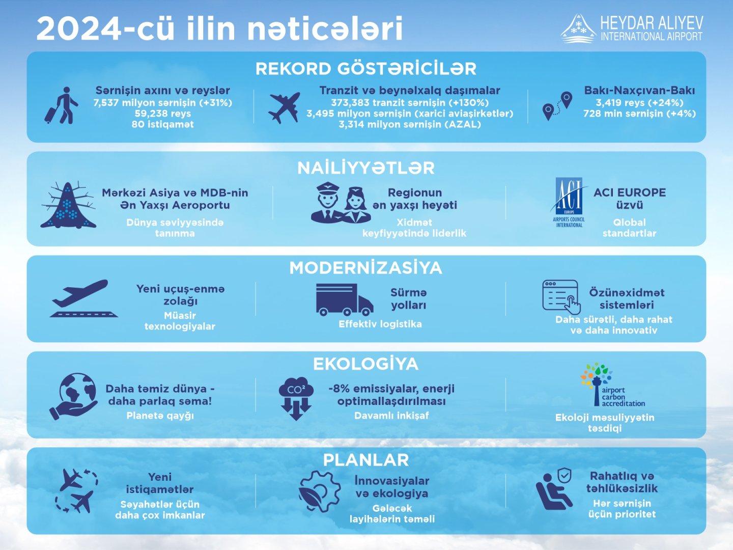 Qeyd edək ki, 2025-ci ildə Heydər Əliyev Beynəlxalq Aeroportu marşrut şəbəkəsinin genişləndirilməsi, yeni texnologiyaların tətbiqi yolu ilə xidmət keyfiyyətinin yüksəldilməsi, təhlükəsizlik standartlarının gücləndirilməsi və aviasiya əməliyyatlarının təhlükəsizliyinin prioritet olaraq saxlanılması, eləcə də karbon izinin daha da azaldılması və ekoloji cəhətdən təmiz həllərin tətbiq olunması istiqamətində inkişafını davam etdirəcək.