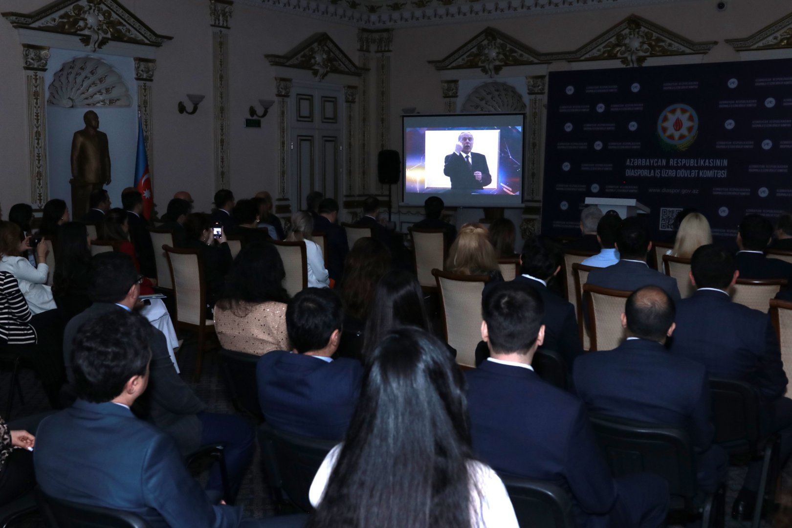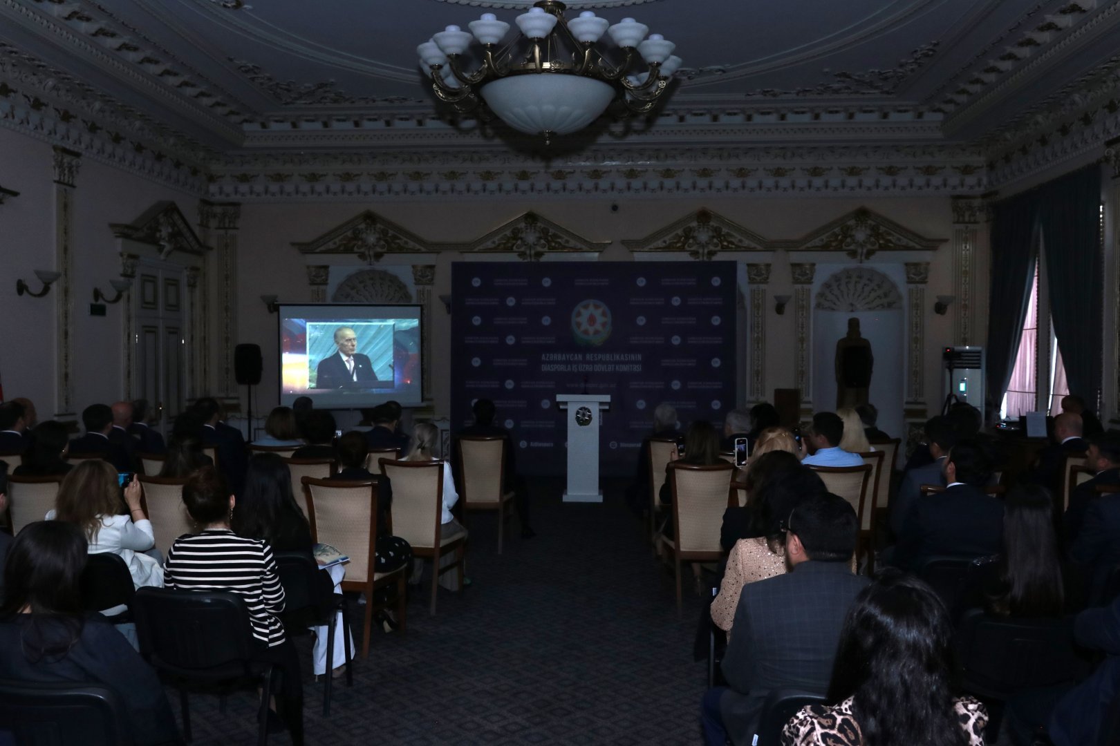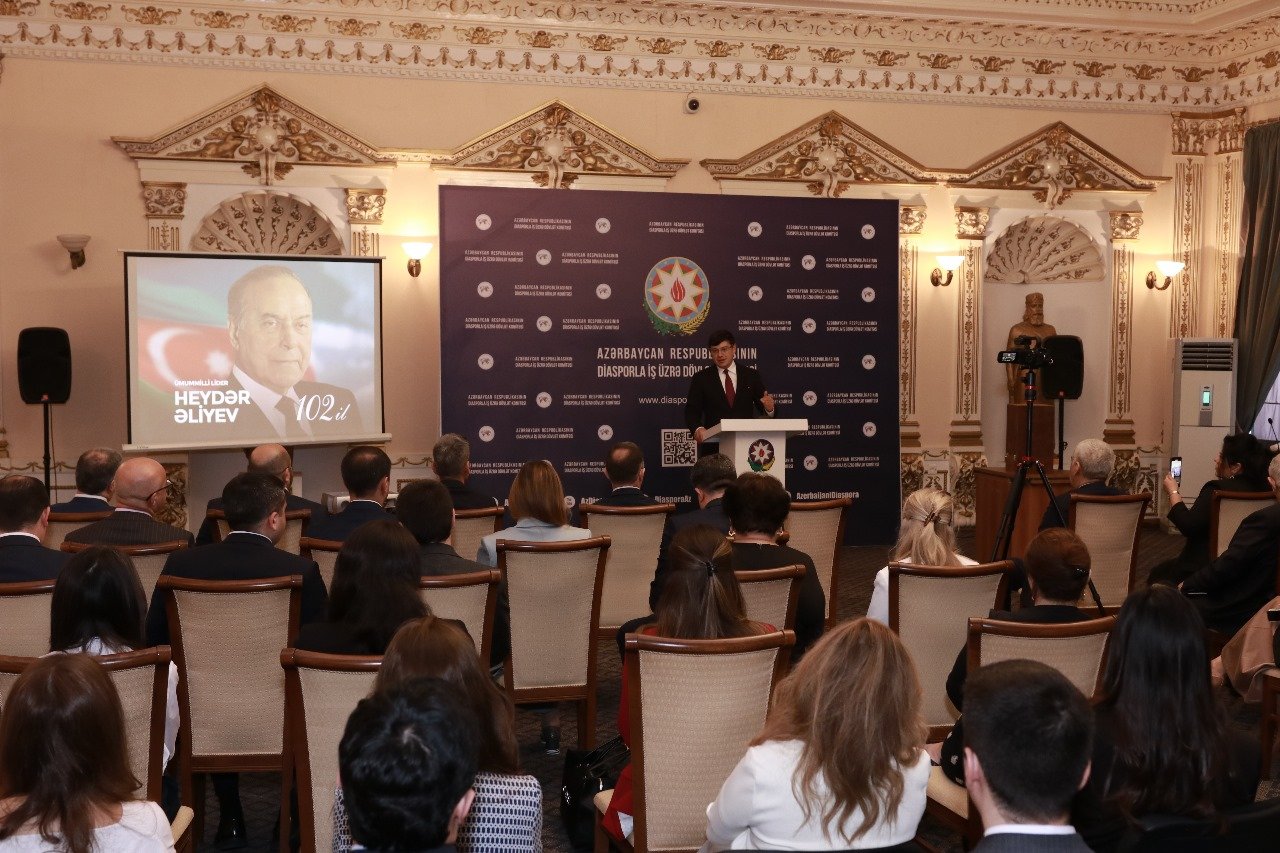 Sədr Fuad Muradov çıxışında Ulu Öndərin müstəqil Azərbaycan Respublikasının müstəqilliyinin qorunması və möhkəmlənməsindəki yorulmaz fəaliyyətini xatırladıb. Azərbaycan diasporunun formalaşması, vahid diaspor şəbəkəsinin yaradılması üçün hərtərəfli düşünülmüş, məqsədyönlü siyasətindən bəhs edib. Prezident İlham Əliyevin tapşırıqları, Birinci vitse-prezident Mehriban Əliyevanın təşəbbüsü və Heydər Əliyev Fondunun dəstəyi ilə milli-mədəni irsimizin qorunub saxlanması, xaricdə yaşayan azərbaycanlıların təşkilatlanması, Azərbaycan həqiqətlərinin dünya ictimaiyyətinə çatdırılması məqsədilə ardıcıl və davamlı işlərin görüldüyünü, müxtəlif ölkələrdə Azərbaycan evlərinin açıldığını diqqətə çatdırıb.