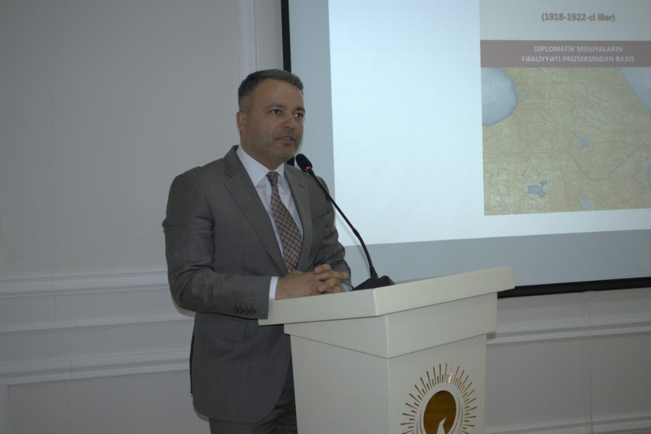 Daha sonra çıxış edən kitabın müəllifi Fəxri Valehoğlu-Hacıyev bildirmişdir ki, Türk dövlətləri və xalqlarının tarixinin, o cümlədən diplomatiya tarixinin araşdırılması Türk Mədəniyyəti və İrsi Fondunun əsas məqsədləri sırasındadır, bu xüsusda Azərbaycan Xalq Cümhuriyyətinin (AXC) İslam və Türk Dünyasında ilk dünyəvi demokratik respublika olduğu nəzərə alınsa, bu respublikanın tarixinin öyrənilməsi, o cümlədən beynəlxalq əlaqələrinin və diplomatik missiyalarının fəaliyyətinin araşdırılması Türk Dünyası diplomatiya mirasının tədqiqi baxımından önəmlidir. AXC-nin süqutundan sonra yaradılmış Azərbaycan İctimai Şura Cümhuriyyətinin də formal da olsa müstəqil dövlət sayıldığını vurğulayan F.Valehoğlu-Hacıyev nə birinci, nə də ikinci Azərbaycan respublikalarının xarici ölkələrdəki, eləcə də xarici ölkələrin həmin respublikalarda diplomatik missiyalarının fəaliyyətinin kompleks şəkildə geniş tədqiqata cəlb edilmədiyinə, təqdim olunan monoqrafiyanın bu sahədə ilk addım olduğuna diqqəti çəkmişdir.
