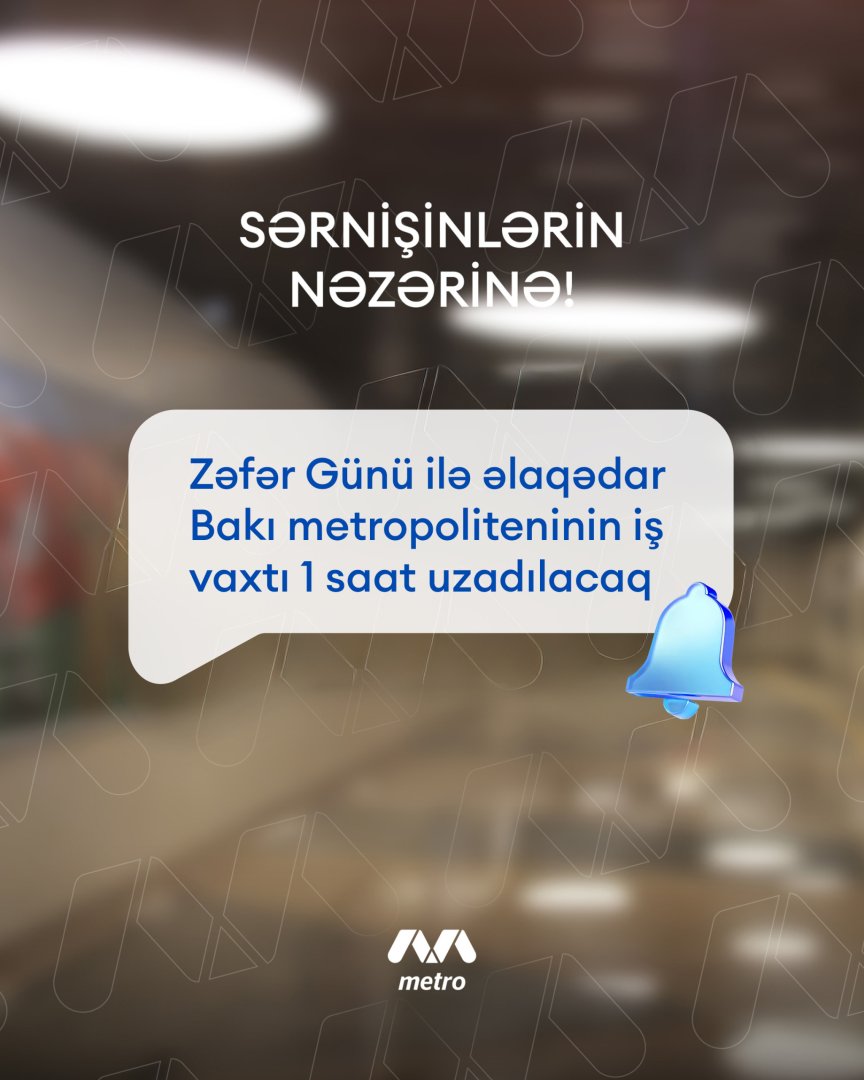 Zəfər Gününün 5-ci ildönümü ilə əlaqədar paytaxtda keçirilən kütləvi-mədəni bayram tədbirləri və şəhər gəzintisi nəzərə alınaraq, Bakı Metropoliteni iş rejimini 1 saat uzadacaq.