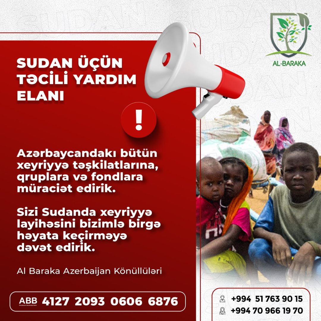 "Al Baraka Azerbaijan" könüllüləri Sudanda humanitar vəziyyətin pisləşməsi ilə bağlı Azərbaycandakı xeyriyyə təşkilatlarına birgə yardım təşəbbüsünə qoşulmaq çağırışı edib.
