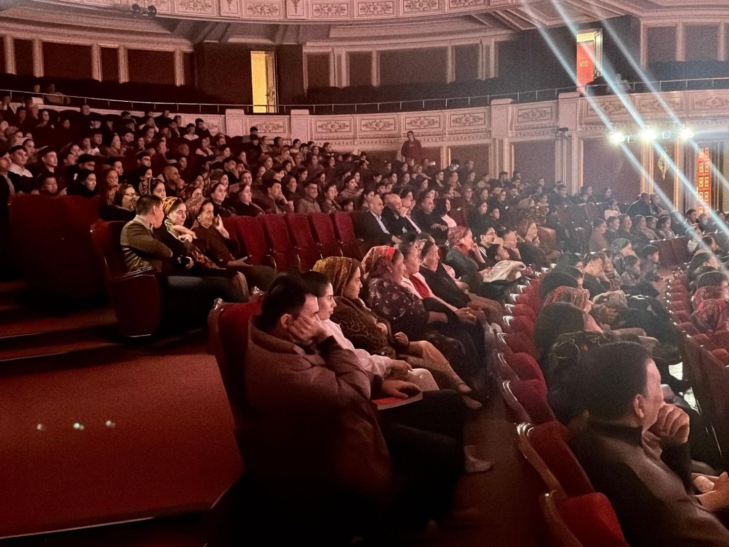 Tamaşanı izləyən Azərbaycanın Türkmənistandakı Səfirliyinin kollektivi və onların ailə üzvləri sonda sənətçilərlə görüşərək, onlara gül dəstələri təqdim ediblər.