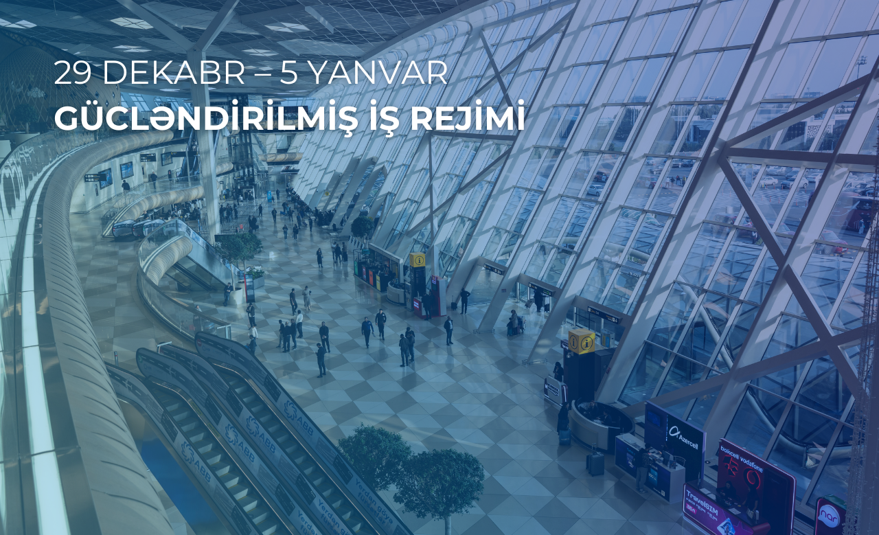 Qarşıdan gələn günlərdə gözlənilən sərnişin axınının artması və səyahət intensivliyinin yüksəlməsi nəzərə alınaraq, 29 dekabr – 5 yanvar tarixlərində Heydər Əliyev Beynəlxalq Aeroportunda sərnişinlərə göstərilən xidmətlərin fasiləsiz, təhlükəsiz və yüksək keyfiyyətlə təmin edilməsi məqsədilə gücləndirilmiş iş rejimi tətbiq olunacaq.