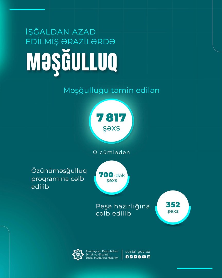 Habelə 352 nəfər müxtəlif istiqamətlər üzrə peşə hazırlığı kurslarına cəlb edilib. Kursları uğurla başa vurmuş şəxslərin işlə təminatına dəstək göstərilir.