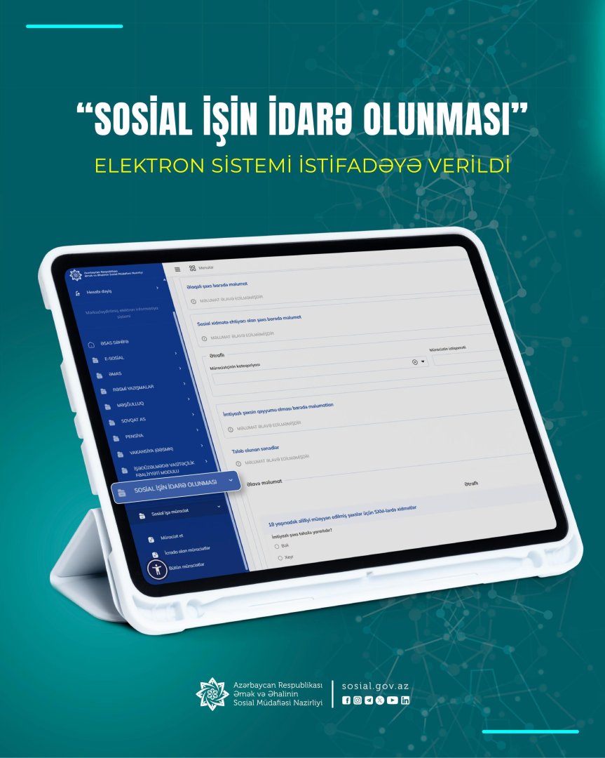 Əmək və Əhalinin Sosial Müdafiəsi Nazirliyinin tabeliyində Sosial Xidmətlər Agentliyi və DOST Rəqəmsal İnnovasiyalar Mərkəzinin birgə layihəsi olaraq “Sosial işin idarə olunması” elektron sistemin ilkin versiyası istifadəyə verilib.