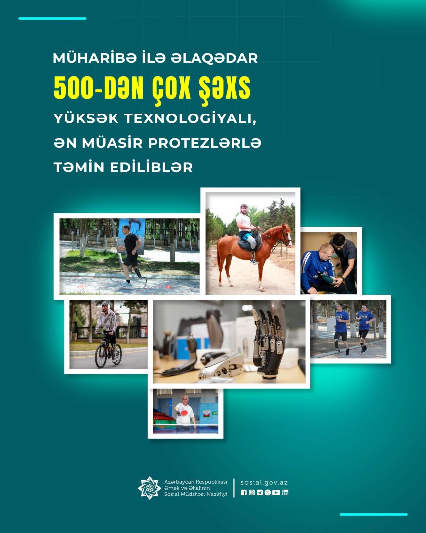 TurkicWorld xəbər verir ki, möhtəşəm tarixi Zəfərimizlə başa çatan Vətən müharibəsindən sonra Əmək və Əhalinin Sosial Müdafiəsi Nazirliyi tərəfindən bu kateqoriyaya aid 500-dən çox hərbçi yüksək texnologiyalı, ən müasir protezlərlə təmin olunub.
