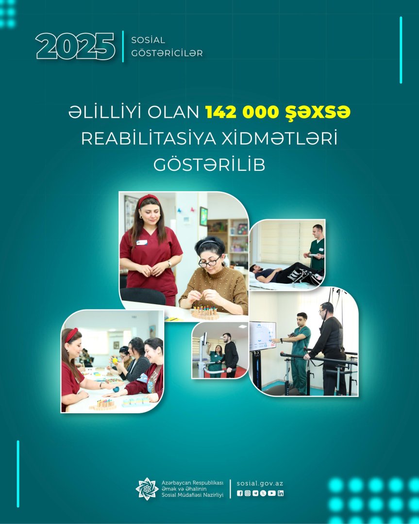 Əmək və Əhalinin Sosial Müdafiəsi Nazirliyinin tabeliyində Dövlət Tibbi-Sosial Ekspertiza və Reabilitasiya Agentliyi 2025-ci ildə əlilliyi olan 142 min şəxsi reabilitasiya xidmətləri ilə təmin edib.
