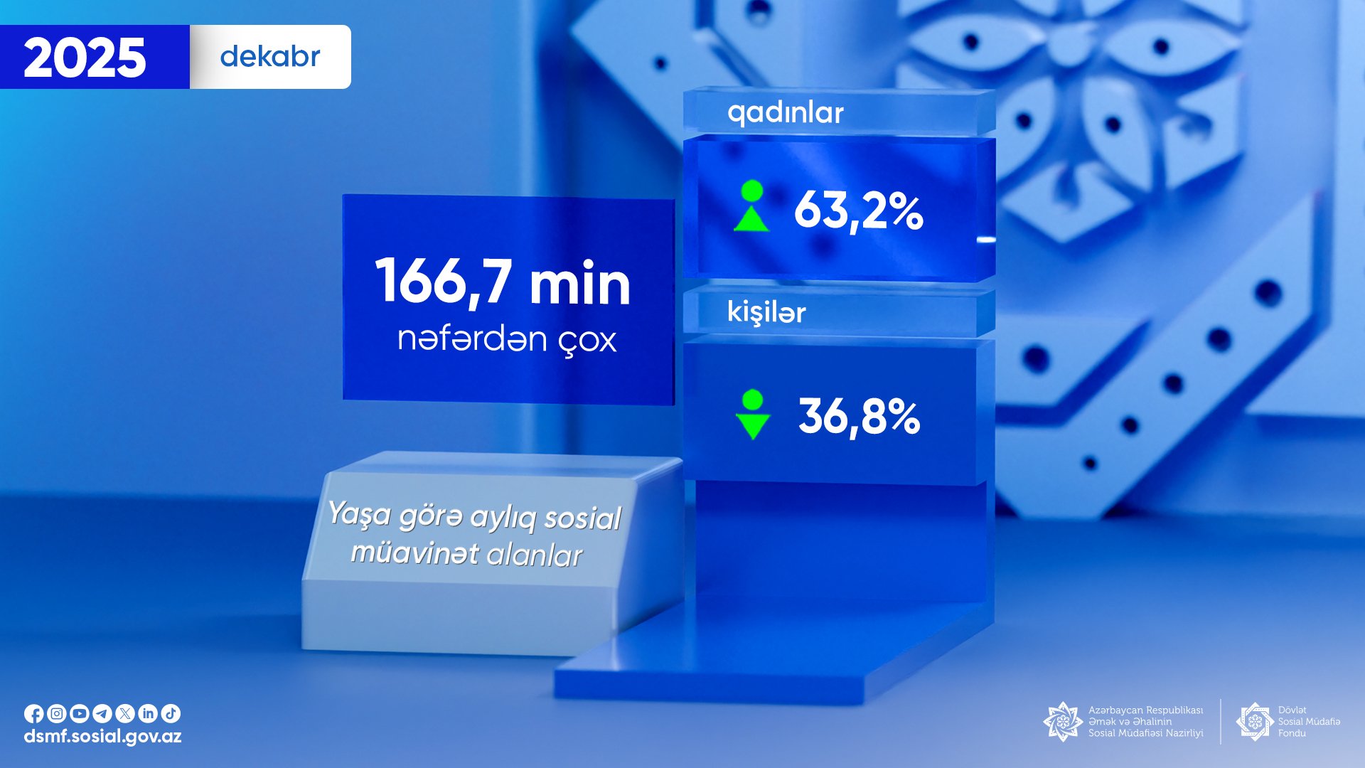 2025-ci ilin dekabr ayında yaşa görə aylıq sosial müavinət alanların sayı 166,7 min nəfərdən çox olub.
